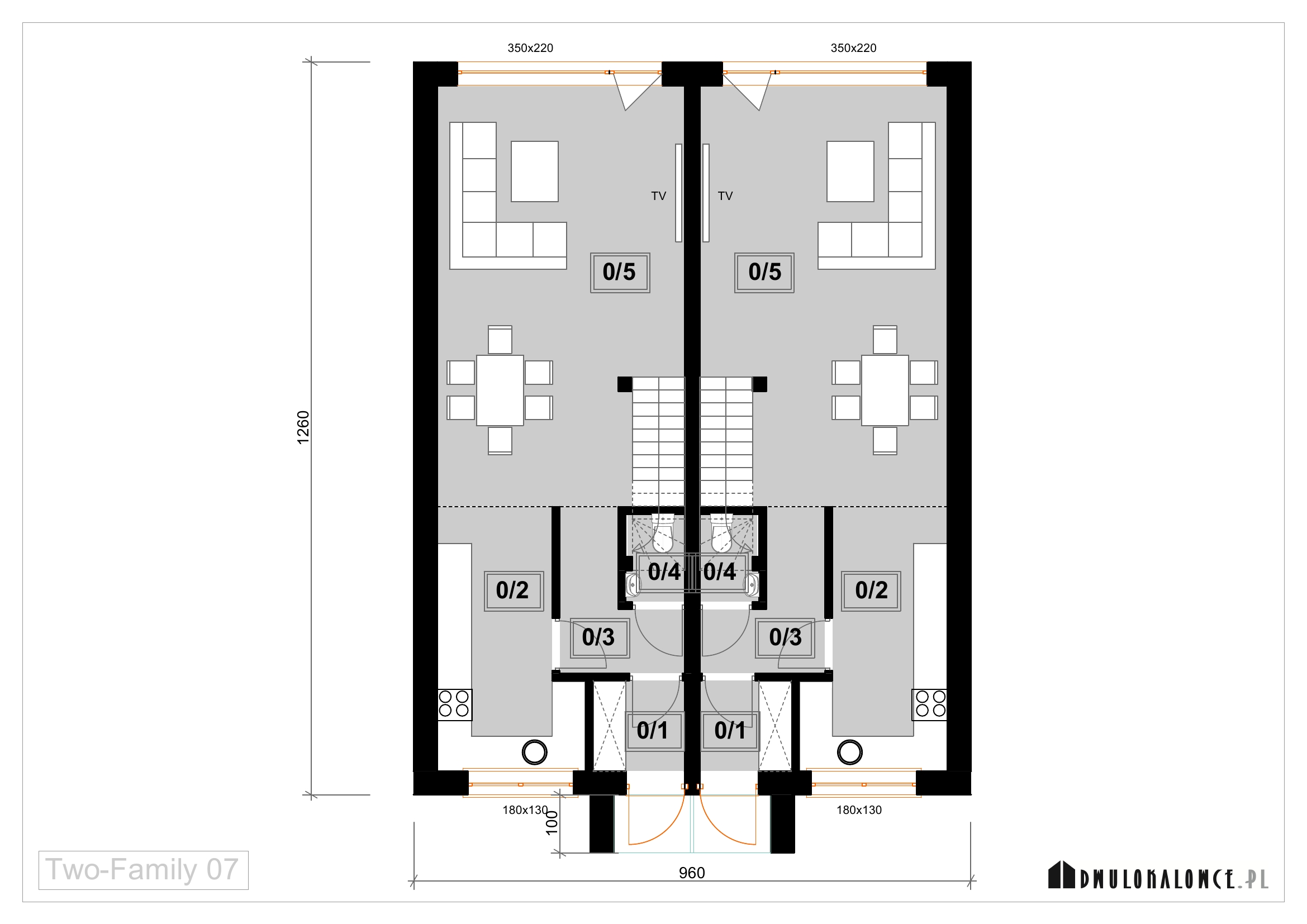 W rzucie budynek ma kształt prostokąta, gdzie elewacja frontowa i tylna znajdują się na bokach krótszych (dzięki temu projekt nadaje się do zastosowania również